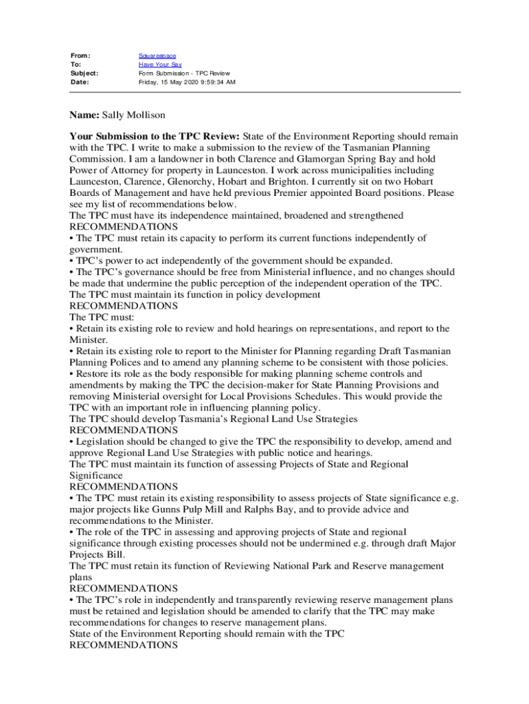 From: To: Subject: Date:Squarespace Have Your Say Form Submission TPC Review Friday, 15 May 2020 9:59:34 Name: Sally Mollison Your Submission to the TPC Review: State of the Environment Reporting