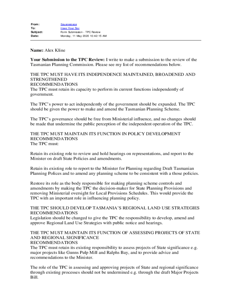 From: To: Subject: Date:Squarespace Have Your Say Form Submission TPC Review Monday, 11 May 2020 10:42:15 Name: Alex Kline Your Submission to the TPC Review: I write to make a submission to the review