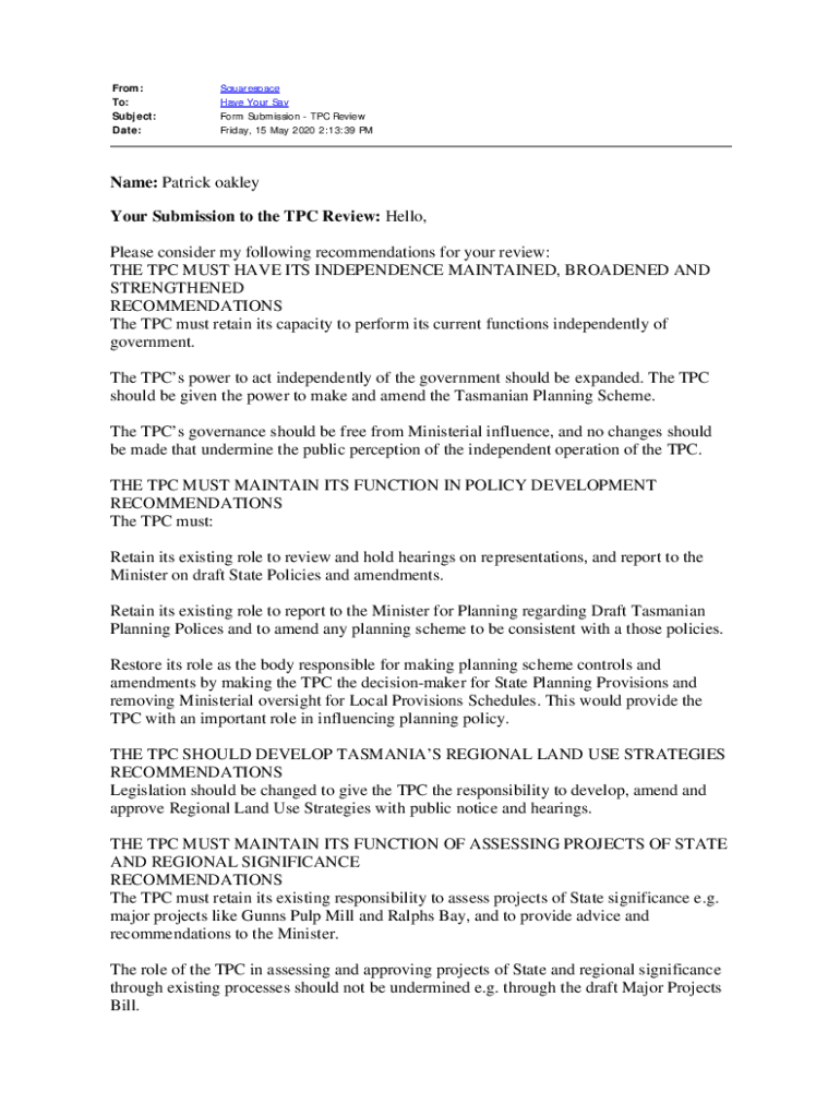 From: To: Subject: Date:Squarespace Have Your Say Form Submission TPC Review Friday, 15 May 2020 2:13:39 Name: Patrick Oakley Your Submission to the TPC Review: Hello, Please consider my following