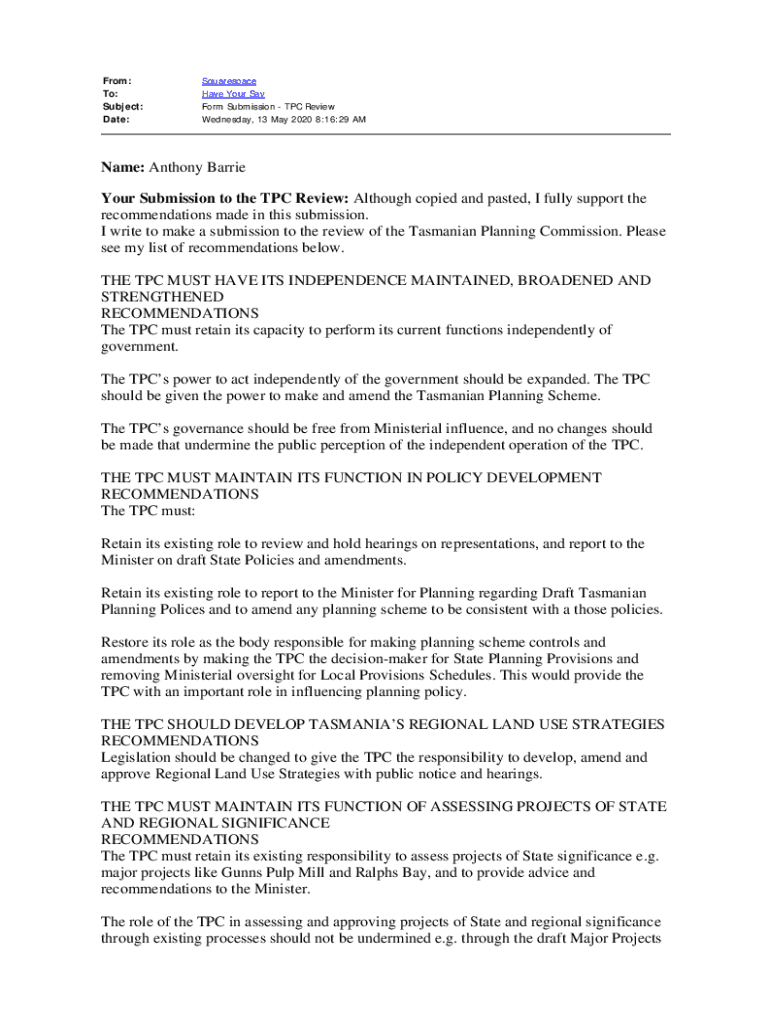 From: To: Subject: Date:Squarespace Have Your Say Form Submission TPC Review Wednesday, 13 May 2020 8:16:29 Name: Anthony Barrie Your Submission to the TPC Review: Although copied and pasted, I fully