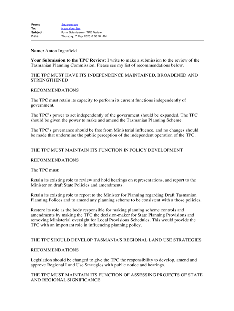 From: To: Subject: Date:Squarespace Have Your Say Form Submission TPC Review Thursday, 7 May 2020 8:56:54 Name: Anton Garfield Your Submission to the TPC Review: I write to make a submission to the