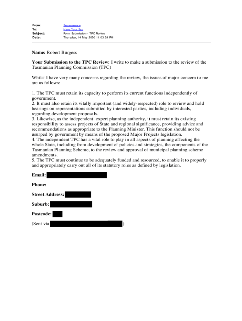 From: To: Subject: Date:Squarespace Have Your Say Form Submission TPC Review Thursday, 14 May 2020 11:03:24 Name: Robert Burgess Your Submission to the TPC Review: I write to make a submission to