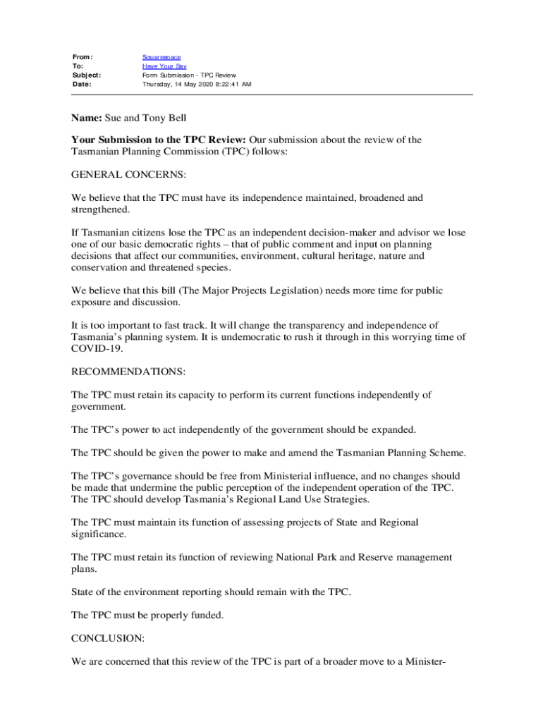 From: To: Subject: Date:Squarespace Have Your Say Form Submission TPC Review Thursday, 14 May 2020 8:22:41 Name: Sue and Tony Bell Your Submission to the TPC Review: Our submission about the review