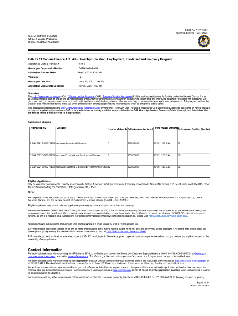 OMB No.11210329 Approval Expires 12/31/2023 U.S. Department of Justice Office of Justice Programs Bureau of Justice Assistance FY 21 Second Chance Act: Adult Reentry Education, Employment, Treatment