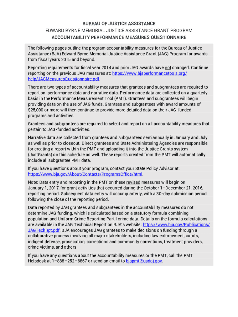 BUREAU OF JUSTICE ASSISTANCE EDWARD BYRNE MEMORIAL JUSTICE ASSISTANCE GRANT PROGRAM ACCOUNTABILITY PERFORMANCE MEASURES QUESTIONNAIRE The following pages outline the program accountability measures