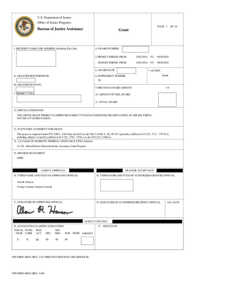 U.S. Department of Justice Office of Justice Programs PAGE 1Bureau of Justice Assistance 20Grant1. RECIPIENT NAME AND ADDRESS (Including Zip Code)4. AWARD NUMBER: 5. PROJECT PERIOD: FROM10/01/2016TO09/30/2020BUDGET