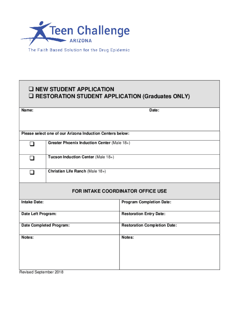 NEW STUDENT APPLICATION RESTORATION STUDENT APPLICATION (Graduates ONLY) Name:Date:Please select one of our Arizona Induction Centers below:Greater Phoenix Induction Center (Male 18+)Tucson Induction