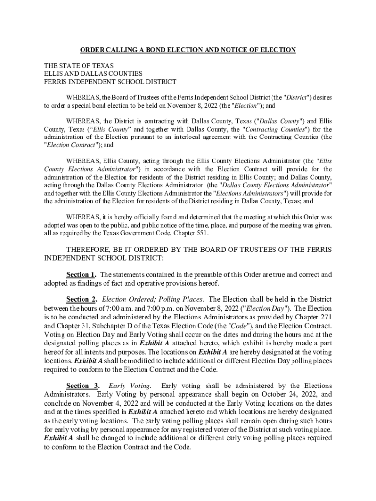 ORDER CALLING A BOND ELECTION AND NOTICE OF ELECTION THE STATE OF TEXAS ELLIS AND DALLAS COUNTIES FERRIS INDEPENDENT SCHOOL DISTRICT WHEREAS, the Board of Trustees of the Ferris Independent School