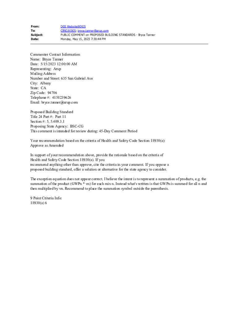 From: To: Subject: Date:DGS Websites CASCADES; bryce.tanner@arup.com PUBLIC COMMENT on PROPOSED BUILDING STANDARDS Bryce Tanner Monday, May 15, 2023 7:30:44 Commenter Contact Information Name: Bryce