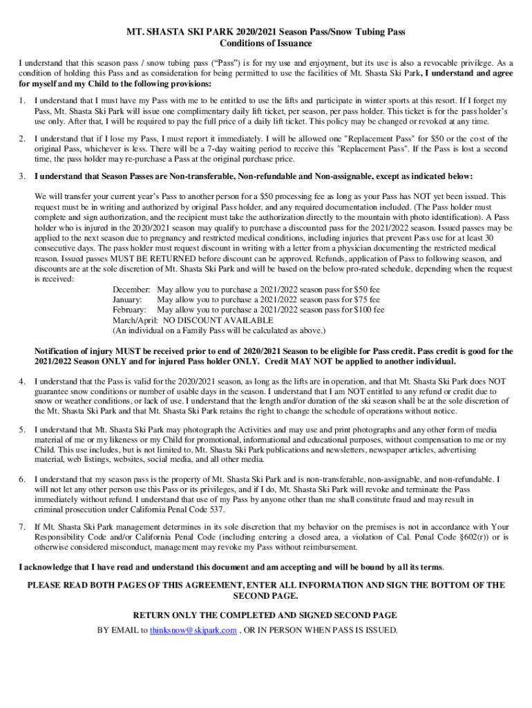 MT. SHASTA SKI PARK 2020/2021 Season Pass/Snow Tubing Pass Conditions of Issuance I understand that this season pass / snow tubing pass (Pass) is for my use and enjoyment, but its use is also a revocable