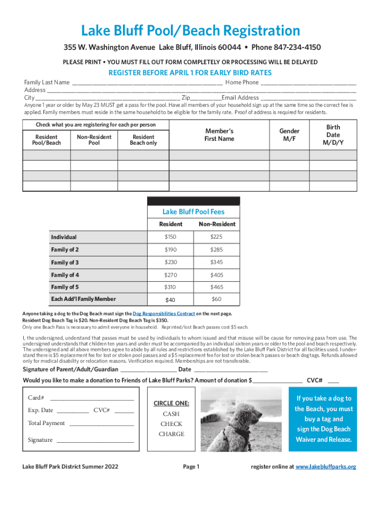 Lake Bluff Pool/Beach Registration 355 W. Washington Avenue Lake Bluff, Illinois 60044 Phone 8472344150 PLEASE PRINT YOU MUST FILL OUT FORM COMPLETELY OR PROCESSING WILL BE DELAYEDREGISTER BEFORE