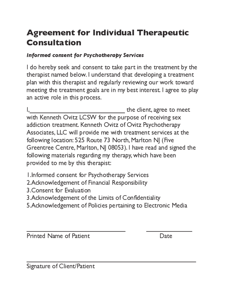 Agreement for Individual Therapeutic Consultation Informed consent for Psychotherapy Services do hereby seek and consent to take part in the treatment by the therapist named below. I understand that