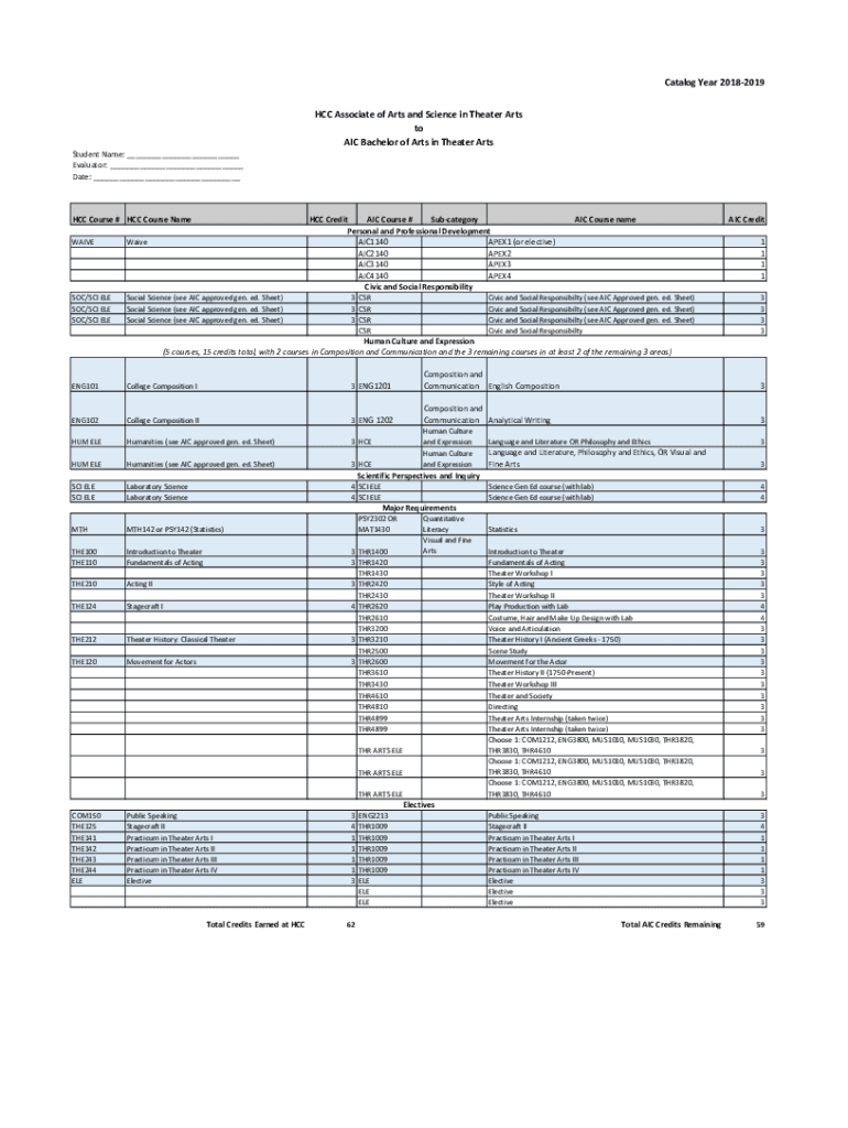Catalog Year 20182019 HCC Associate of Arts and Science in Theater Arts to AIC Bachelor of Arts in Theater Arts Student Name: ___ Evaluator: ___ Date: ___HCC Course # HCC Course Name HCC Credit AIC