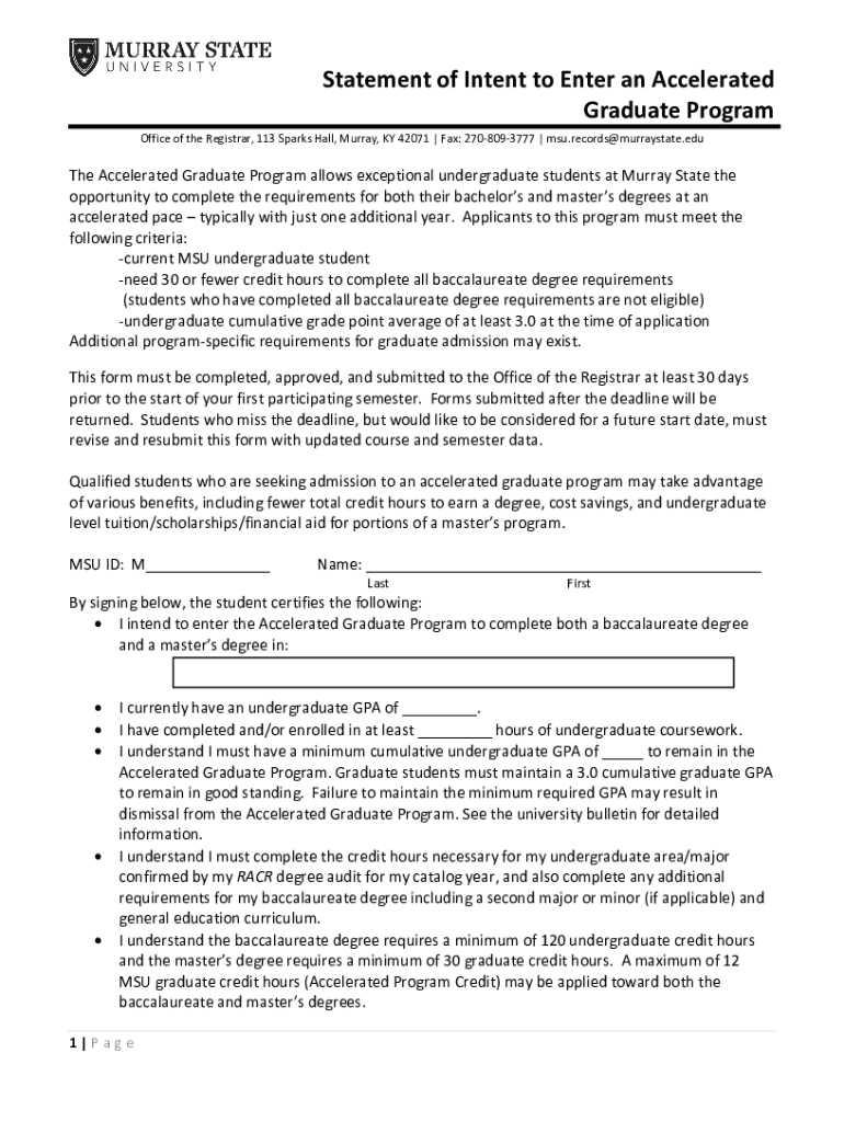 Statement of Intent to Enter an Accelerated Graduate Program Office of the Registrar, 113 Sparks Hall, Murray, KY 42071 | Fax: 2708093777 | msu.records@murraystate.eduThe Accelerated Graduate Program