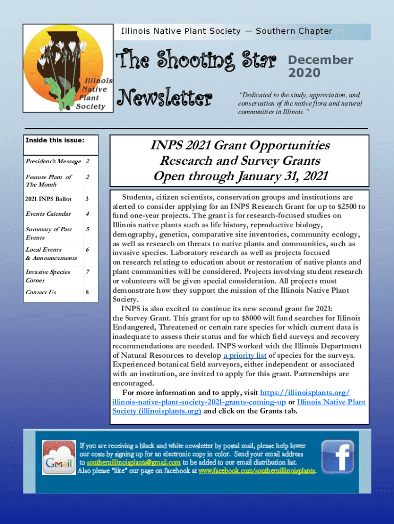 Illinois Native Plant Society Southern Chapter Shooting Star Newsletter Inside this issue:Presidents Message 2 Feature Plant of The Month22021 INS Ballot3Events Calendar4Summary of Past Events5Local