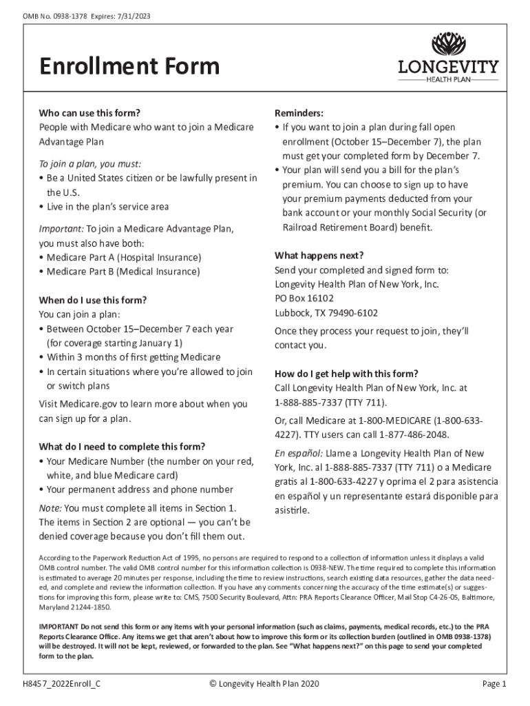 OMB No. 09381378 Expires: 7/31/2023Enrollment Form Who can use this form? People with Medicare who want to join a Medicare Advantage Plan To join a plan, you must: Be a United States citizen or be