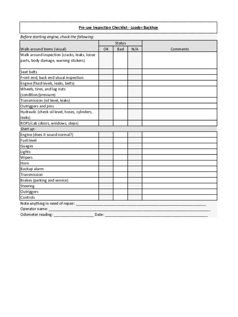 Reuse Inspection Checklist Loader Backhoe Before starting engine, check the following: Walk around items (visual) Walk around inspection (cracks, leaks, loose parts, body damage, warning stickers)Status