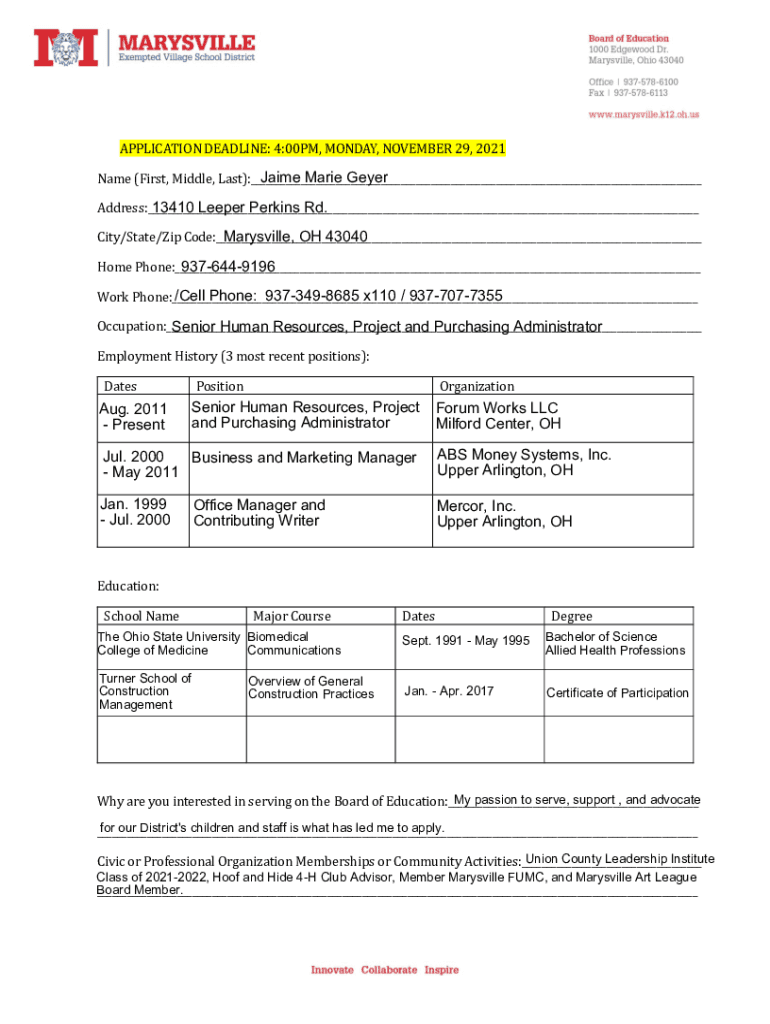 APPLICATION DEADLINE: 4:00PM, MONDAY, NOVEMBER 29, 2021Jaime Marie Layer Name (First, Middle, Last):___ 13410 Deeper Perkins Rd. Address:___ Marysville, OH 43040 City/State/Zip Code:___ 9376449196