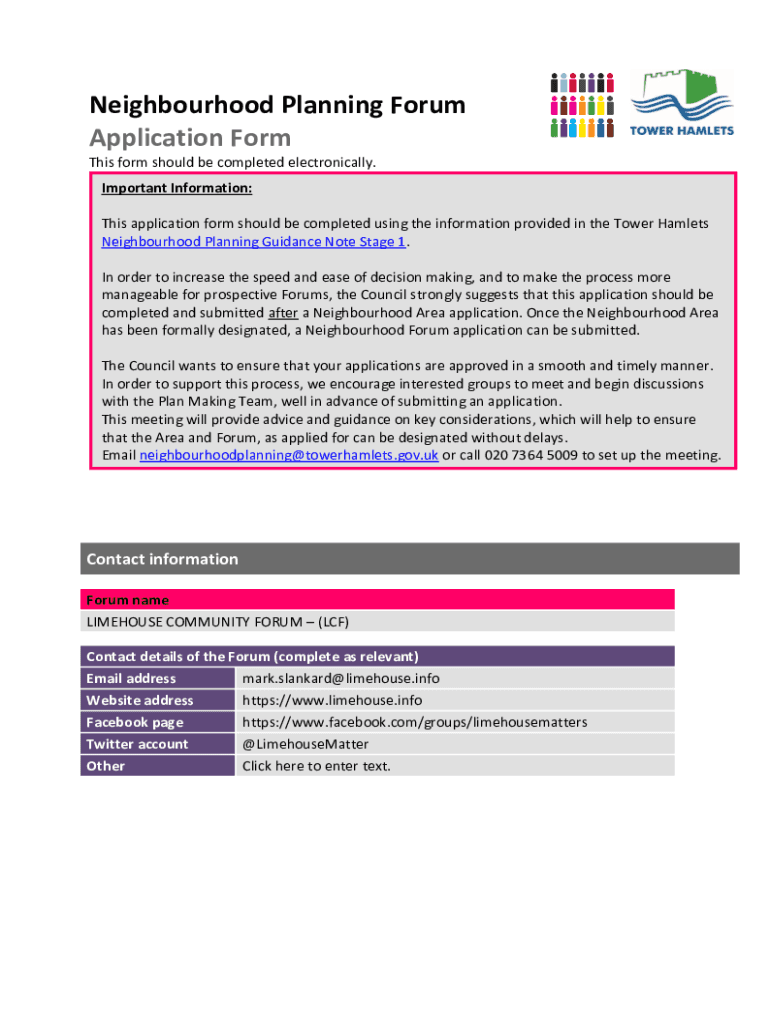 Neighborhood Planning Forum Application Form This form should be completed electronically. Important Information: This application form should be completed using the information provided in the Tower