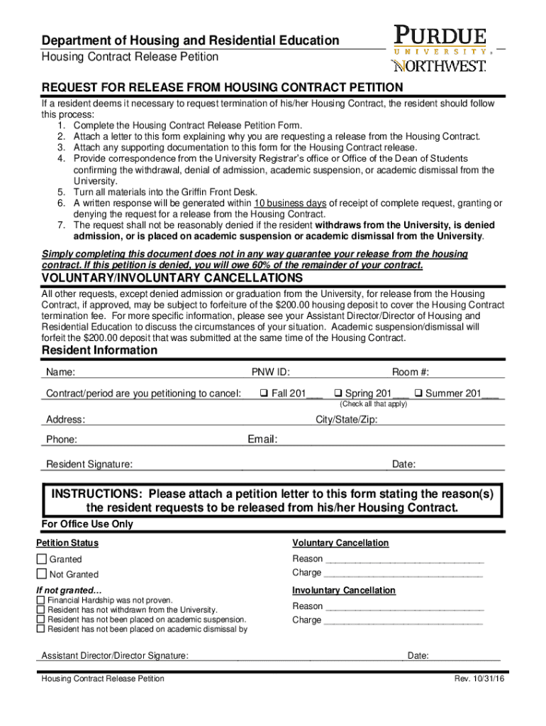 Department of Housing and Residential Education Housing Contract Release Petition REQUEST FOR RELEASE FROM HOUSING CONTRACT PETITION If a resident deems it necessary to request termination of his/her