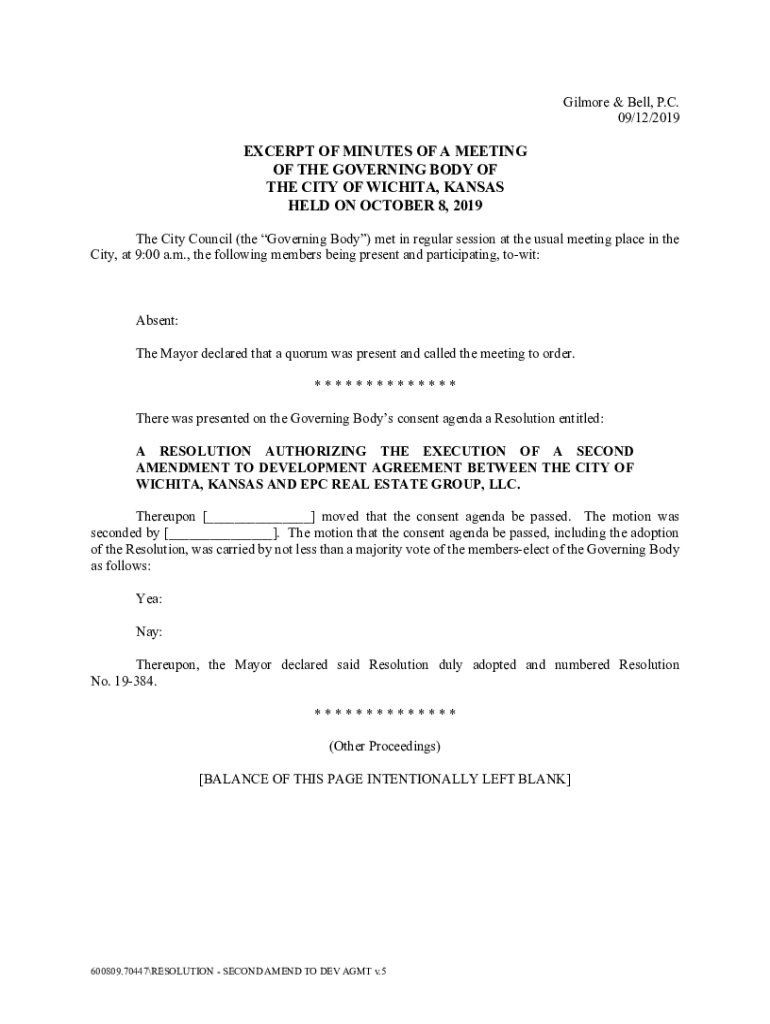 Gilmore & Bell, P.C. 09/12/2019EXCERPT OF MINUTES OF A MEETING OF THE GOVERNING BODY OF THE CITY OF WICHITA, KANSAS HELD ON OCTOBER 8, 2019, The City Council (the Governing Body) met in regular session