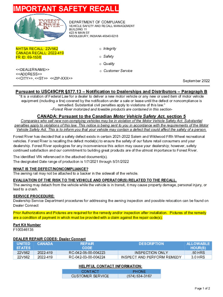 IMPORTANT SAFETY RECALL DEPARTMENT OF COMPLIANCEVEHICLE SAFETY AND RECALL MANAGEMENT BUILDING 11 423 N MAIN ST MIDDLEBURY, INDIANA 465409218NHTSA RECALL: 22V562 CANADA RECALL: 2022419 FR ID: 691538:
