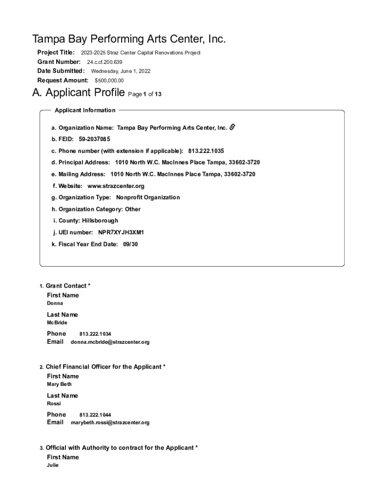 Tampa Bay Performing Arts Center, Inc. Project Title: 20232025 Straw Center Capital Renovations Project Grant Number: 24.c.cf.200.639 Date Submitted: Wednesday, June 1, 2022, Request Amount: $500,000.00A.