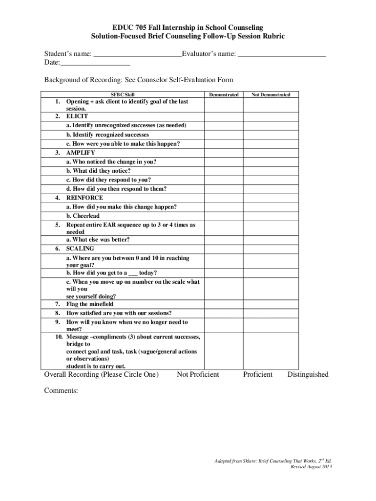 EDUC 705 Fall Internship in School Counseling SolutionFocused Brief Counseling Followup Session Rubric Students name: ___Evaluators name: ___ Date:___ Background of Recording: See Counselor Reevaluation