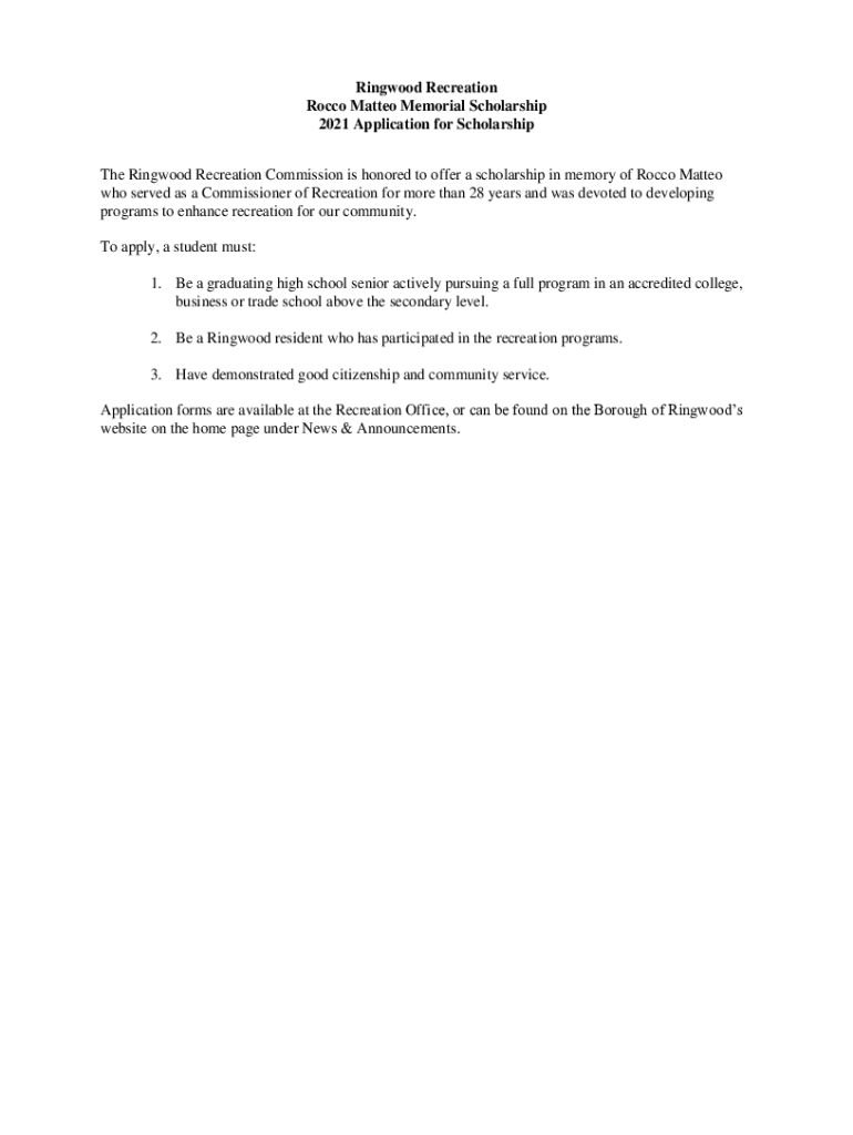 The Ring wood Recreation Commission is honored to offer a scholarship in memory of Rocco Matteo