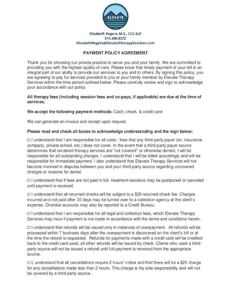 PAYMENT POLICY AGREEMENT Thank you for choosing our private practice to serve you and your family. We are committed to providing you with the highest quality of care. Please know that timely payment