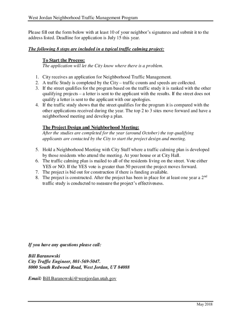 West Jordan Neighborhood Traffic Management Program Please fill out the form below with at least 10 of your neighbors signatures and submit it to the address listed. Deadline for application is July