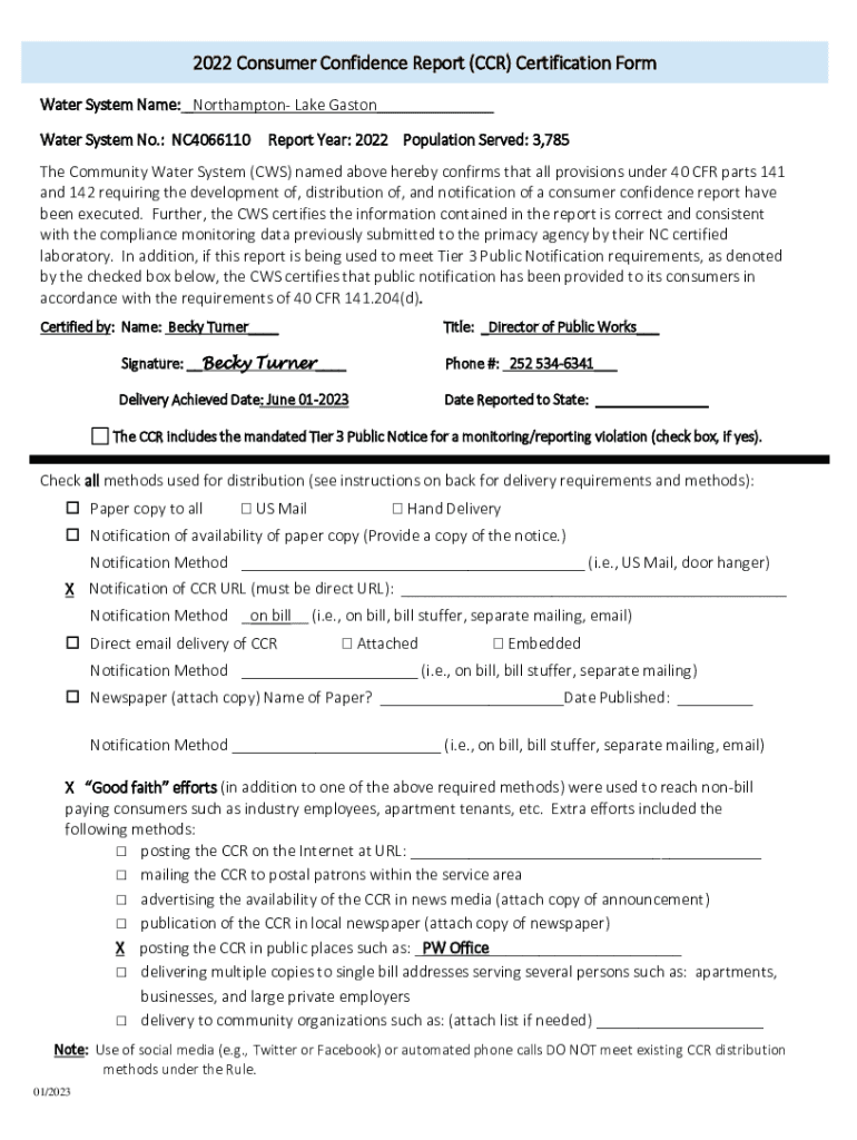 2022 Consumer Confidence Report (CCR) Certification Form Water System Name: _Northampton Lake Gaston___ Water System No.: NC4066110Report Year: 2022 Population Served: 3,785The Community Water System