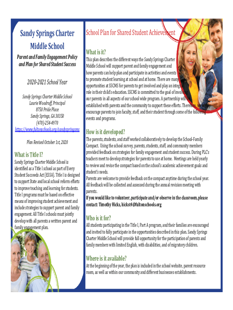 Sandy Springs Charter Middle School Parent and Family Engagement Policy and Plan for Shared Student Success20202021 School Year Sandy Springs Charter Middle School Laurie Woodruff, Principal 8750