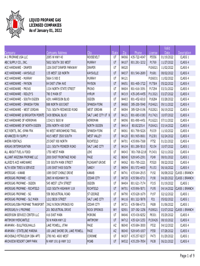 LIQUID PROPANE GAS LICENSED COMPANIES As of January 01, 2022StateZipPhoneLicenseValid DateDescriptionROOSEVELTUT840664357224047P555601/19/2022CLASS 15602 SOUTH 300 WESTMURRAYUT84107801 2813232P176911/27/2022CLASS