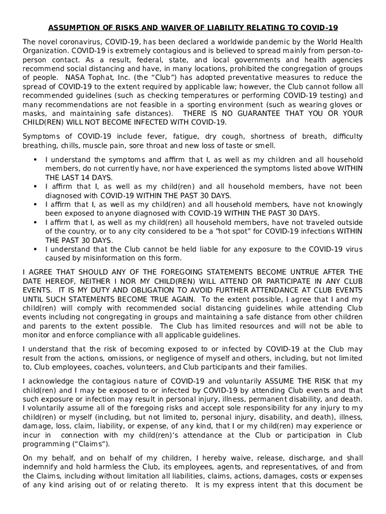 The Youth Recreation Participant Assumption of Risk and ... is a writable document required to be submitted to the required address in order to provide specific information. It must be filled-out and signed, which may be done manually in hard copy, or using a certain software like PDFfiller. This tool helps to fill out any PDF or Word document right in the web, customize it depending on your requirements and put a legally-binding e-signature. Right after completion, user can send the Youth Recreation Participant Assumption of Risk and ... to the relevant person, or multiple ones via email or fax. The template is printable too thanks to PDFfiller feature and options offered for printing out adjustment. Both in electronic and in hard copy, your form should have a neat and professional outlook. It's also possible to save it as the template to use later, there's no need to create a new file from scratch. All that needed is to customize the ready form.