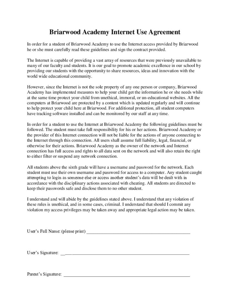 Get the free Briarwood Academy Internet Use Agreement