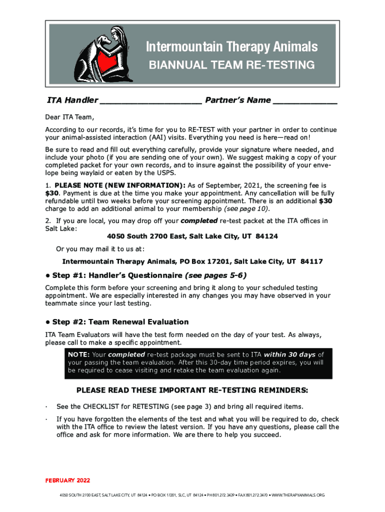 1Intermountain Therapy Animals BIANNUAL TEAM RETESTING ITA Handler ___ Partners Name ___ Dear ITA Team, According to our records, it's time for you to RETEST with your partner in order to continue