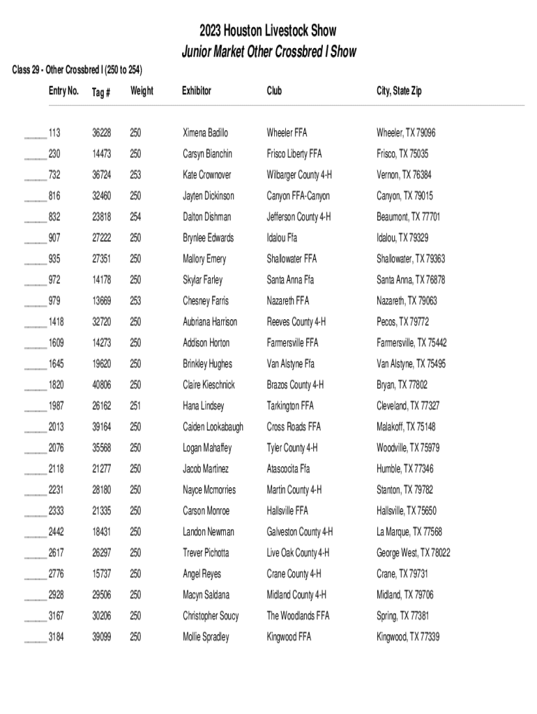 Entry No. Tag #WeightExhibitorClubCity, State Zip___ 11336228250Ximena BadilloWheeler FFA Wheeler,