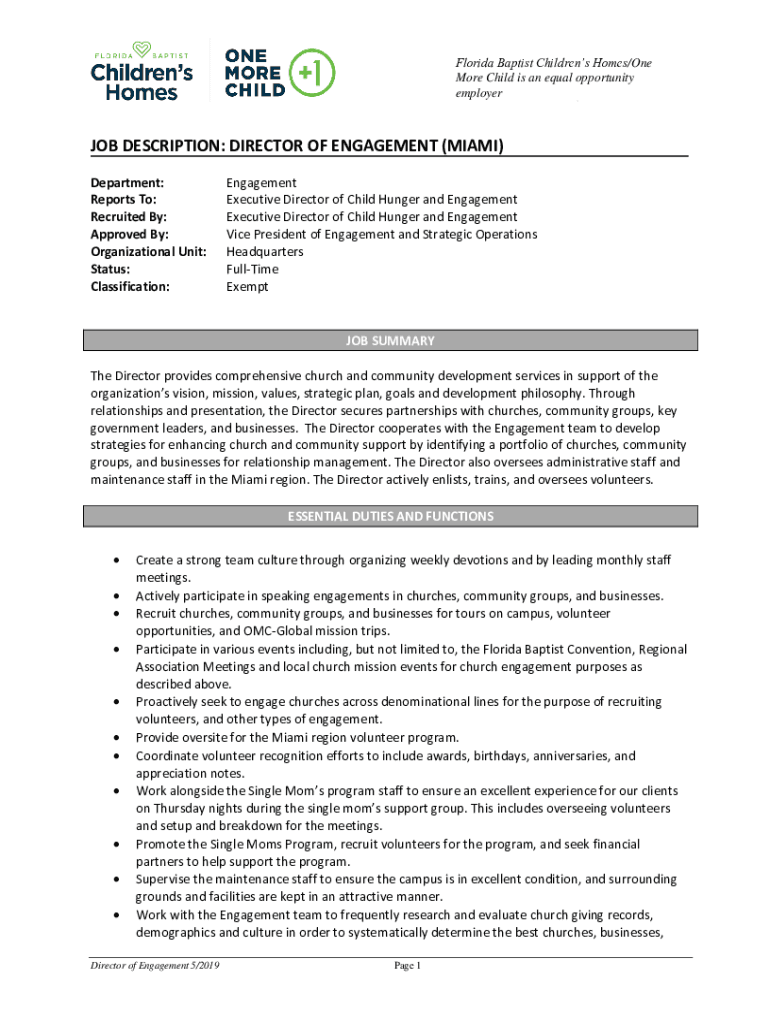 Florida Baptist Children's Homes/One More Child is an equal opportunity employer DESCRIPTION: DIRECTOR OF ENGAGEMENT (MIAMI) Department: Reports To: Recruited By: Approved By: Organizational Unit: