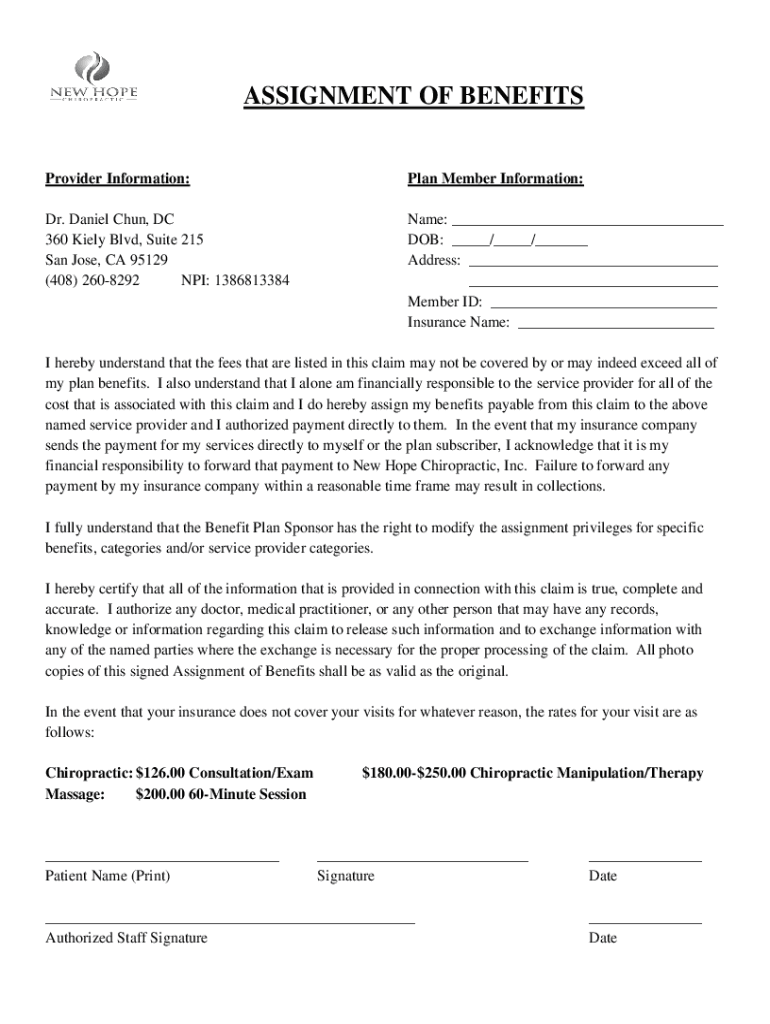 ASSIGNMENT OF BENEFITS Provider Information:Plan Member Information:Dr. Daniel Chen, DC 360 Kiel Blvd, Suite 215 San Jose, CA 95129 (408) 2608292 NPI: 1386813384Name: ___ DOB: ___/___/___ Address: