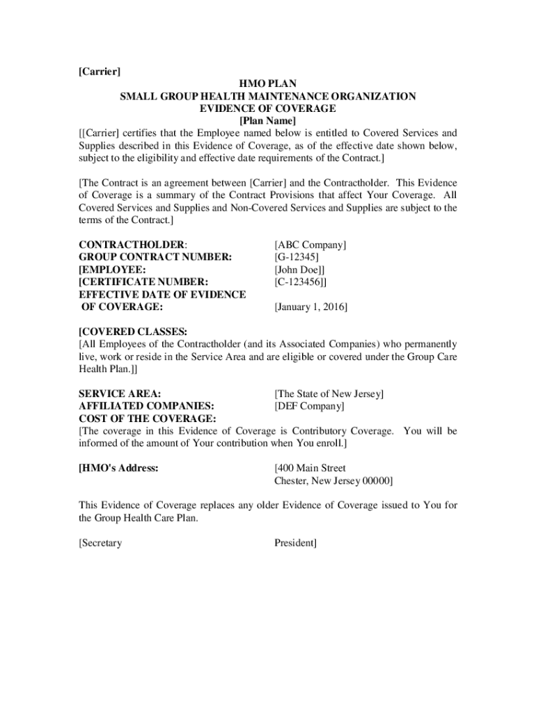 [Carrier] HMO PLAN SMALL GROUP HEALTH MAINTENANCE ORGANIZATION EVIDENCE OF COVERAGE [Plan Name] [[Carrier] certifies that the Employee named below is entitled to Covered Services and Supplies described