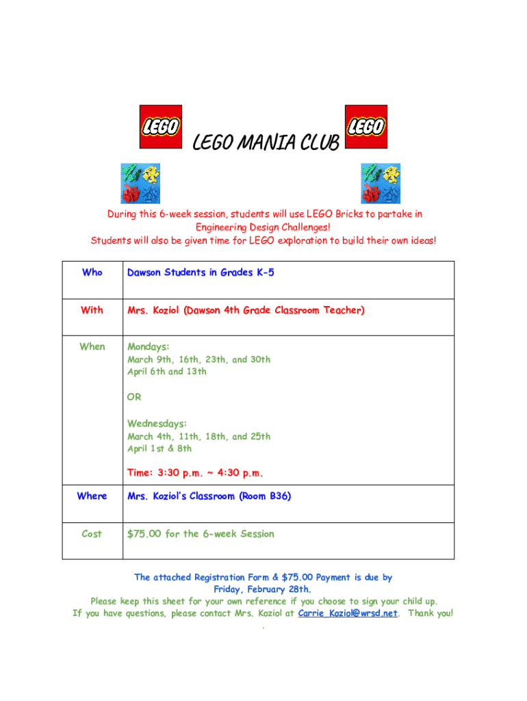 LEGO MANIA Clustering this 6week session, students will use LEGO Bricks to partake in Engineering Design Challenges! Students will also be given time for LEGO exploration to build their own ideas!