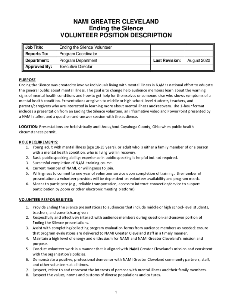 NAME GREATER CLEVELAND Ending the Silence VOLUNTEER POSITION DESCRIPTION Job Title: Reports To:Ending the Silence Volunteer Program CoordinatorDepartment: Approved By:Program Department Executive