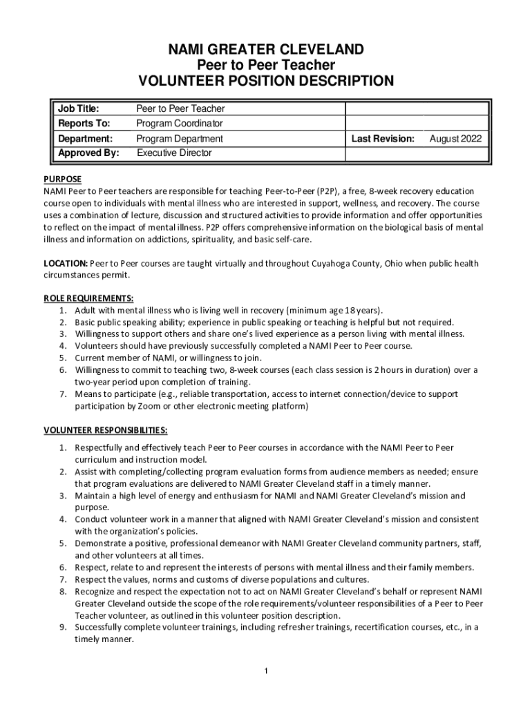 NAME GREATER CLEVELAND Peer to Peer Teacher VOLUNTEER POSITION DESCRIPTION Job Title: Reports To:Peer to Peer Teacher Program CoordinatorDepartment: Approved By:Program Department Executive Directors