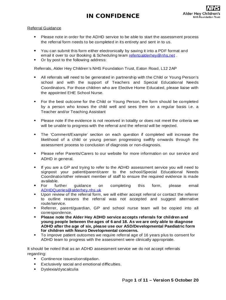 The adhd referral - alderhey nhs is a writable document needed to be submitted to the required address in order to provide some information. It needs to be completed and signed, which can be done manually, or via a certain software like PDFfiller. This tool allows to fill out any PDF or Word document right in the web, customize it according to your purposes and put a legally-binding e-signature. Right away after completion, you can send the adhd referral - alderhey nhs to the relevant individual, or multiple ones via email or fax. The editable template is printable as well thanks to PDFfiller feature and options proposed for printing out adjustment. Both in electronic and in hard copy, your form will have got organized and professional look. It's also possible to turn it into a template for further use, without creating a new blank form again. All you need to do is to amend the ready sample.