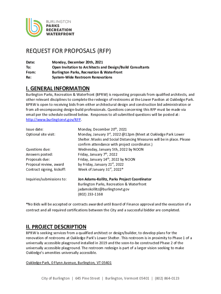 REQUEST FOR PROPOSALS (RFP) Date: To: From: Re:Monday, December 20th, 2021 Open Invitation to Architects and Design/Build Consultants Burlington Parks, Recreation & Waterfront Systemize Restroom Renovations.