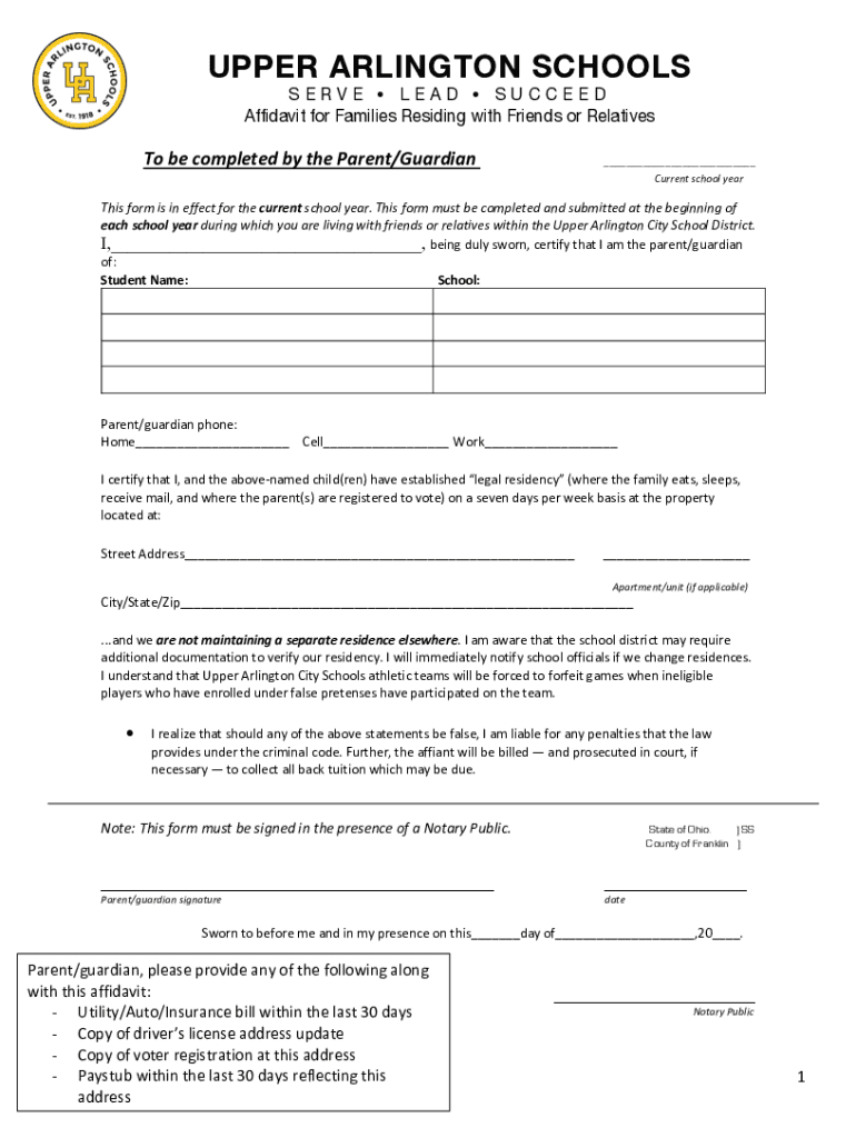 UPPER ARLINGTON SCHOOLS SERVE LEAD SUCCEED Affidavit for Families Residing with Friends or Relatives be completed by the Parent/Guardian___ Current school earths form is in effect for the current