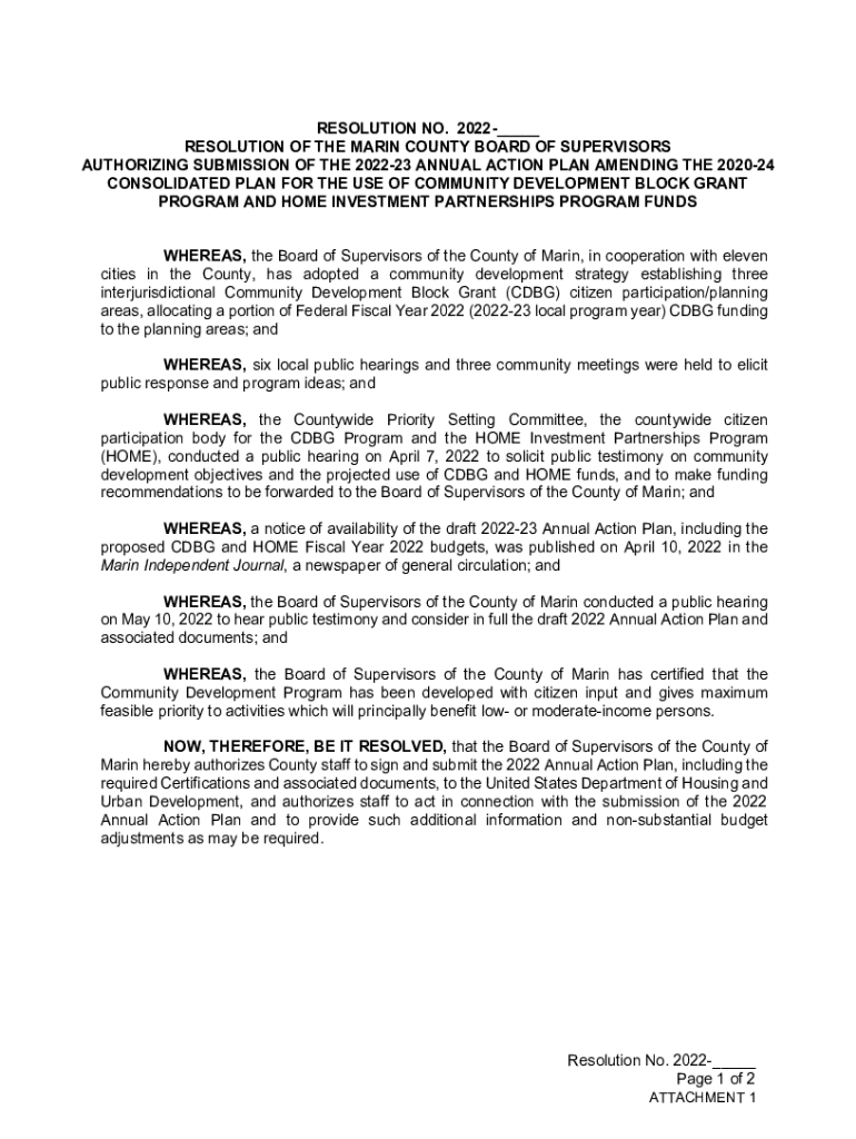 RESOLUTION NO. 2022___ RESOLUTION OF THE MARIN COUNTY BOARD OF SUPERVISORS AUTHORIZING SUBMISSION OF THE 202223 ANNUAL ACTION PLAN AMENDING THE 202024 CONSOLIDATED PLAN FOR THE USE OF COMMUNITY DEVELOPMENT