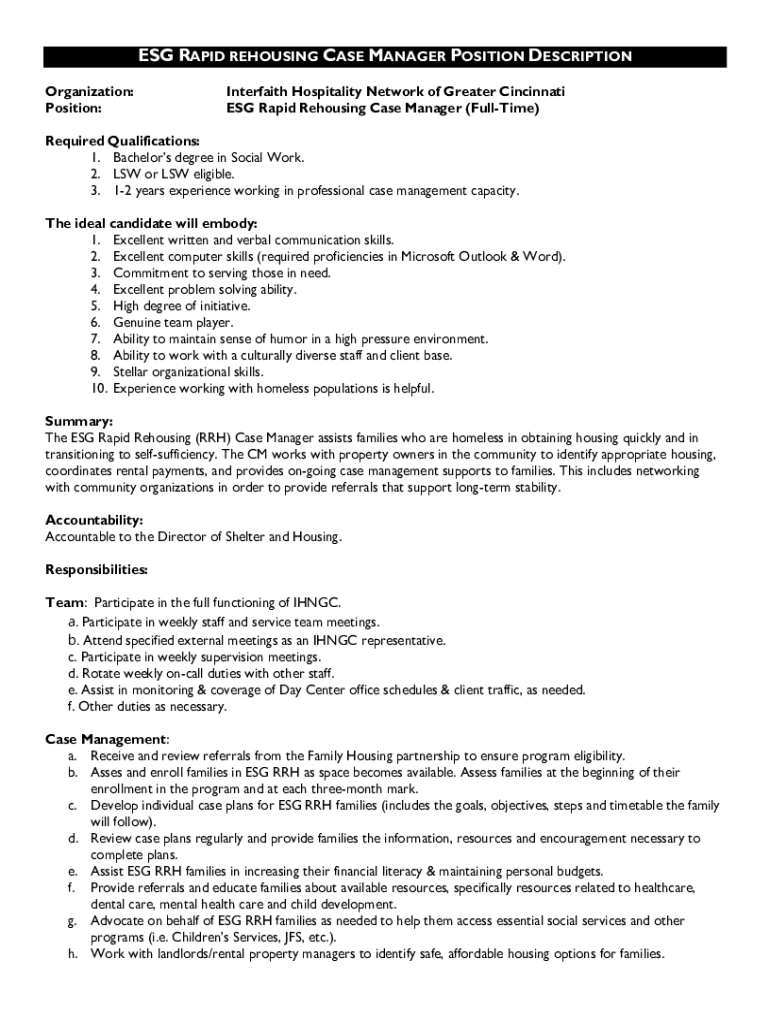 ESG RAPID REHOUSING CASE MANAGER POSITION DESCRIPTION Organization: Position:Interfaith Hospitality Network of Greater Cincinnati ESG Rapid Rehousing Case Manager (Halftime)Required Qualifications: