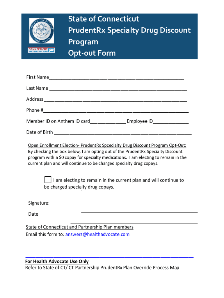State of Connecticut Prudent Rx Specialty Drug Discount Program Op tout Form First Name___ Last Name ___ Address ___ Phone #___ Member ID on Anthem ID card___ Employee ID___ Date of Birth ___ Open